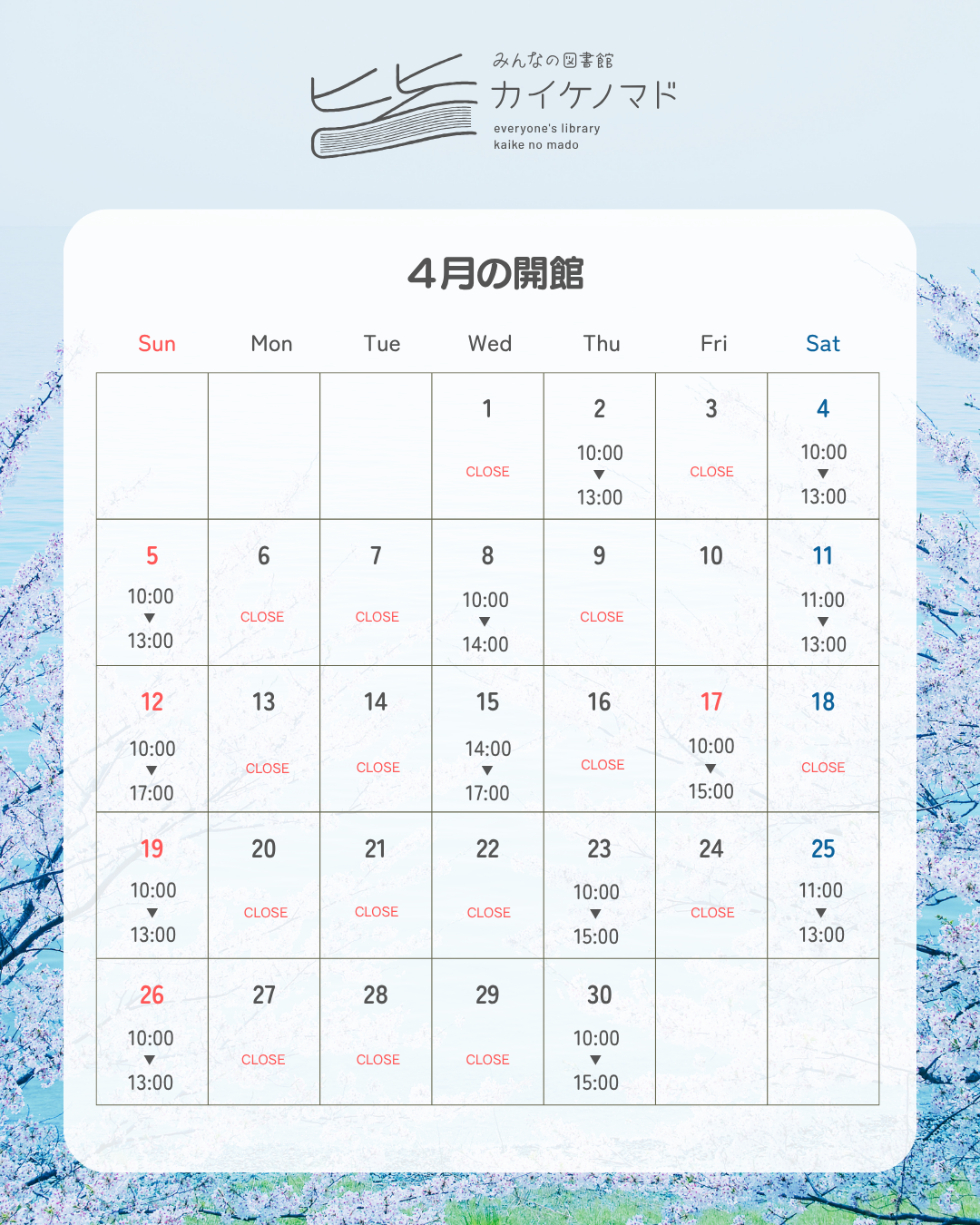 「みんなの図書館カイケノマド」2025年4月の開館カレンダーです。